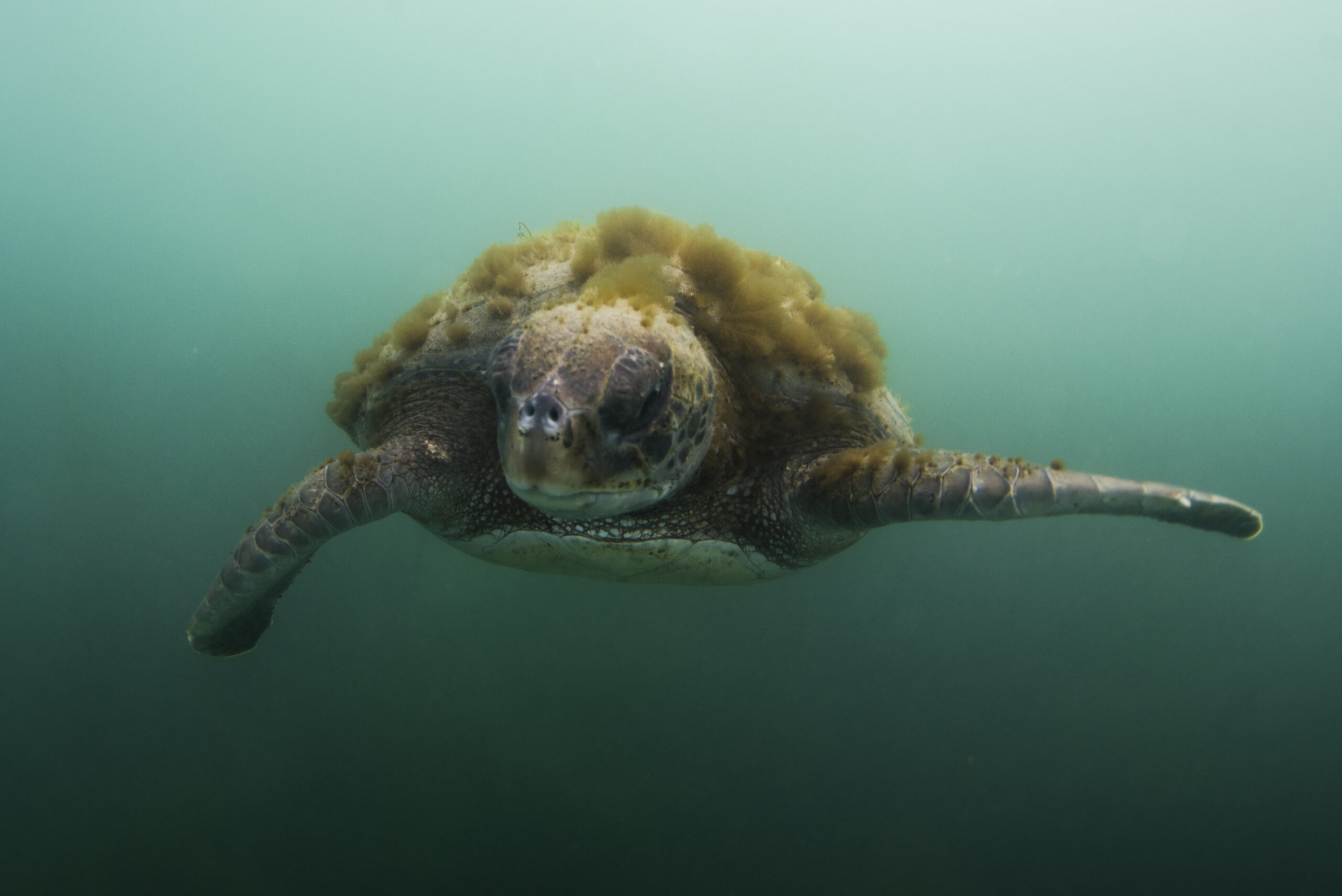 While these turtles have shells that are brownish-olive in color, they get their name from the green tint to their skin. Green sea turtles aren’t just “green” when it comes to their appearance, either. They’re plant-based eaters for the majority of their life, eating primarily vegetation like algae and seagrass once they grow into adulthood. This species contributes to the wellness of seagrass beds as well, trimming the tops of the beds to keep them nice and healthy.
