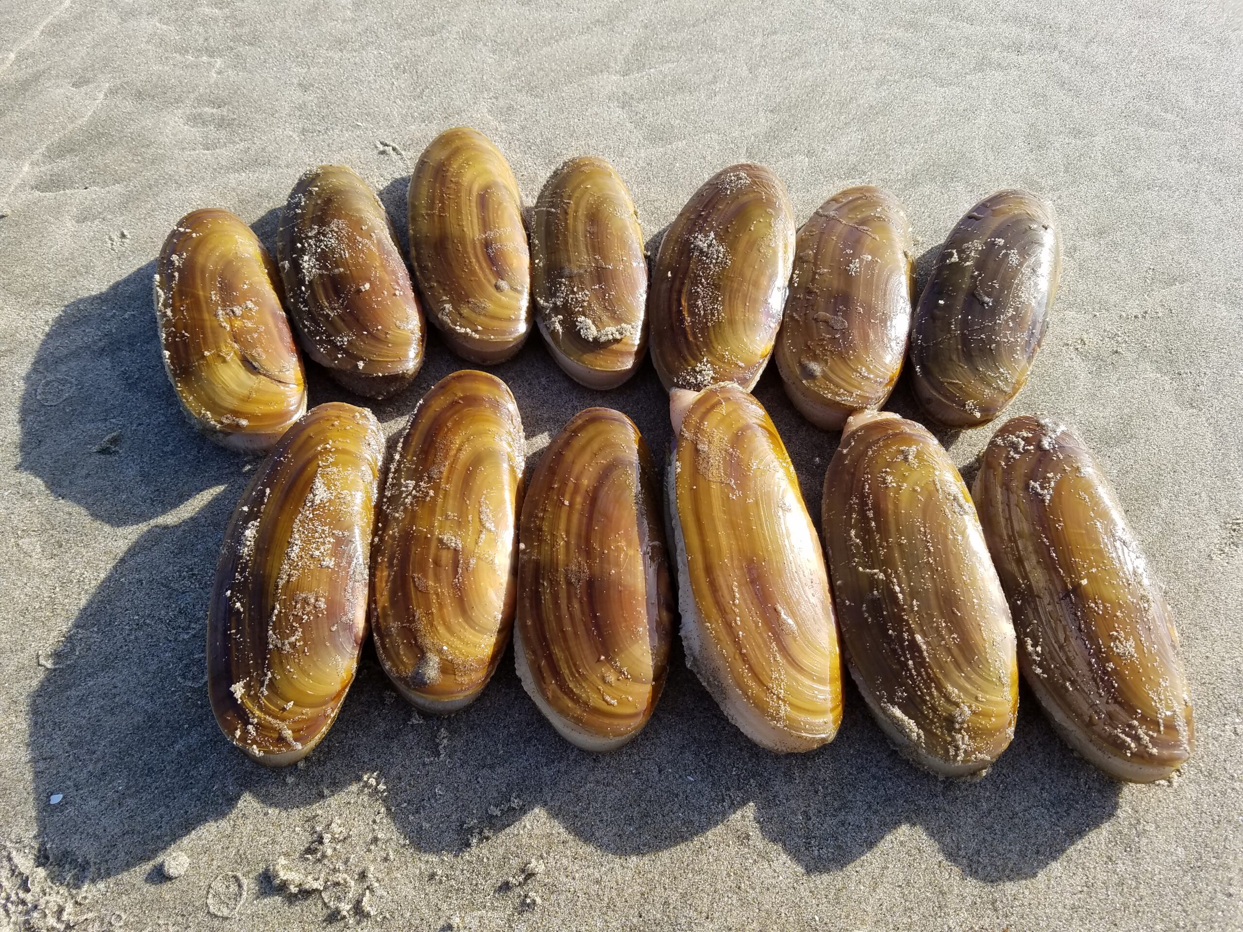 Pacific razor clams are bivalve mollusks that live in sandy beach environments stretching from Alaska to California. In the Pacific Northwest states of Washington and Oregon, an adult razor clam can live up to about six years, attaining a maximum length around six inches—roughly the size of a U.S. dollar bill. Further north in Alaska where the water is colder and clams grow more slowly than in the Pacific Northwest, clams can reach 12 inches in length and live up to 11 years. The species’ thin, “razor-sharp” and fragile shells are unmistakable—especially if you nick your finger on one while sculpting your sandcastle masterpiece at the beach.