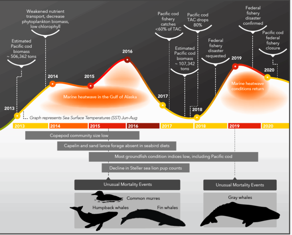 Communities and fisheries in the GOA are still picking up the pieces after the cod collapse. We are just beginning to understand the long-term consequences of heatwaves on the Alaskan ecosystem.