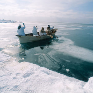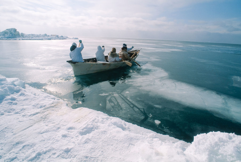 Inupiaq whalers drive a skiff through an open lead in the pack ice during spring whaling season Chukchi Sea.