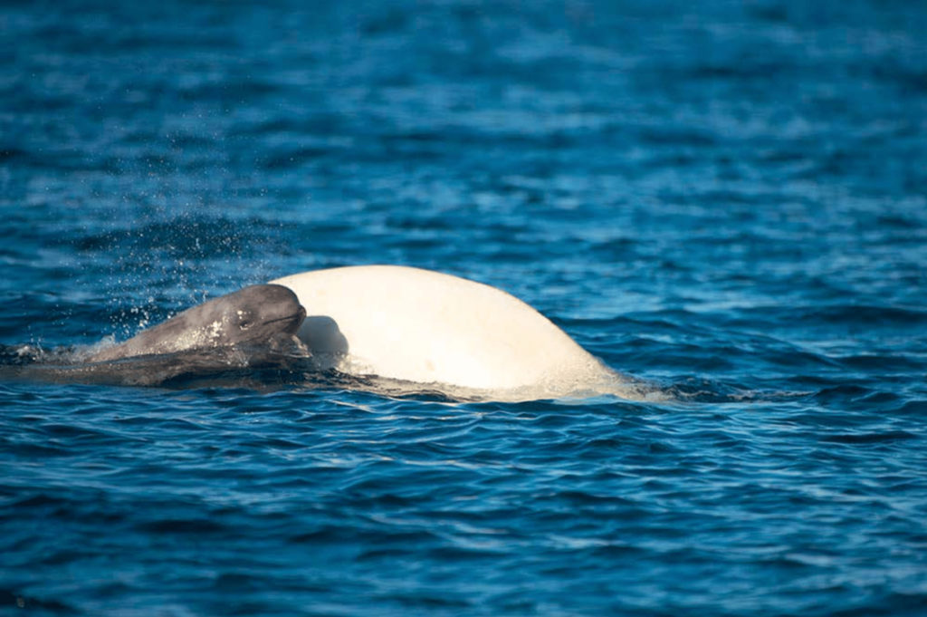 A mother and baby beluga.