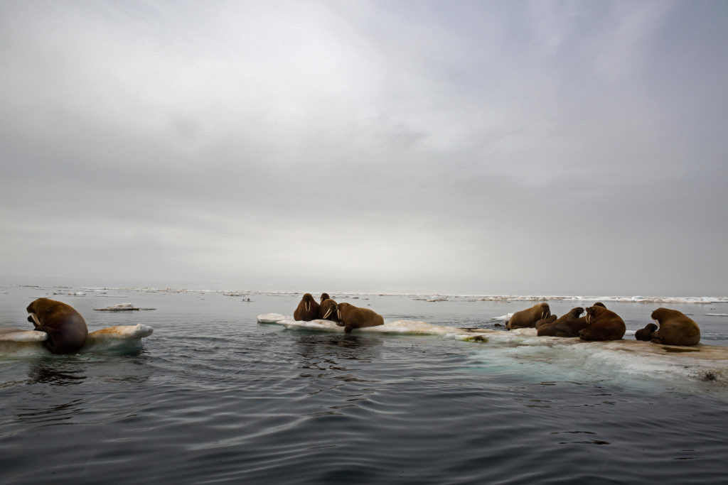 Walrus rest on the sea ice.