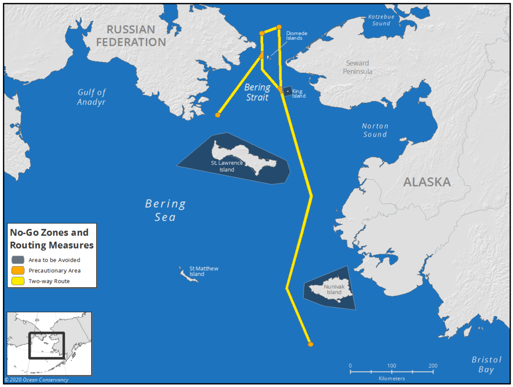 Two-way shipping routes through the Bering Strait help prevent accidents by encouraging ships to travel through well-charted waters offshore.