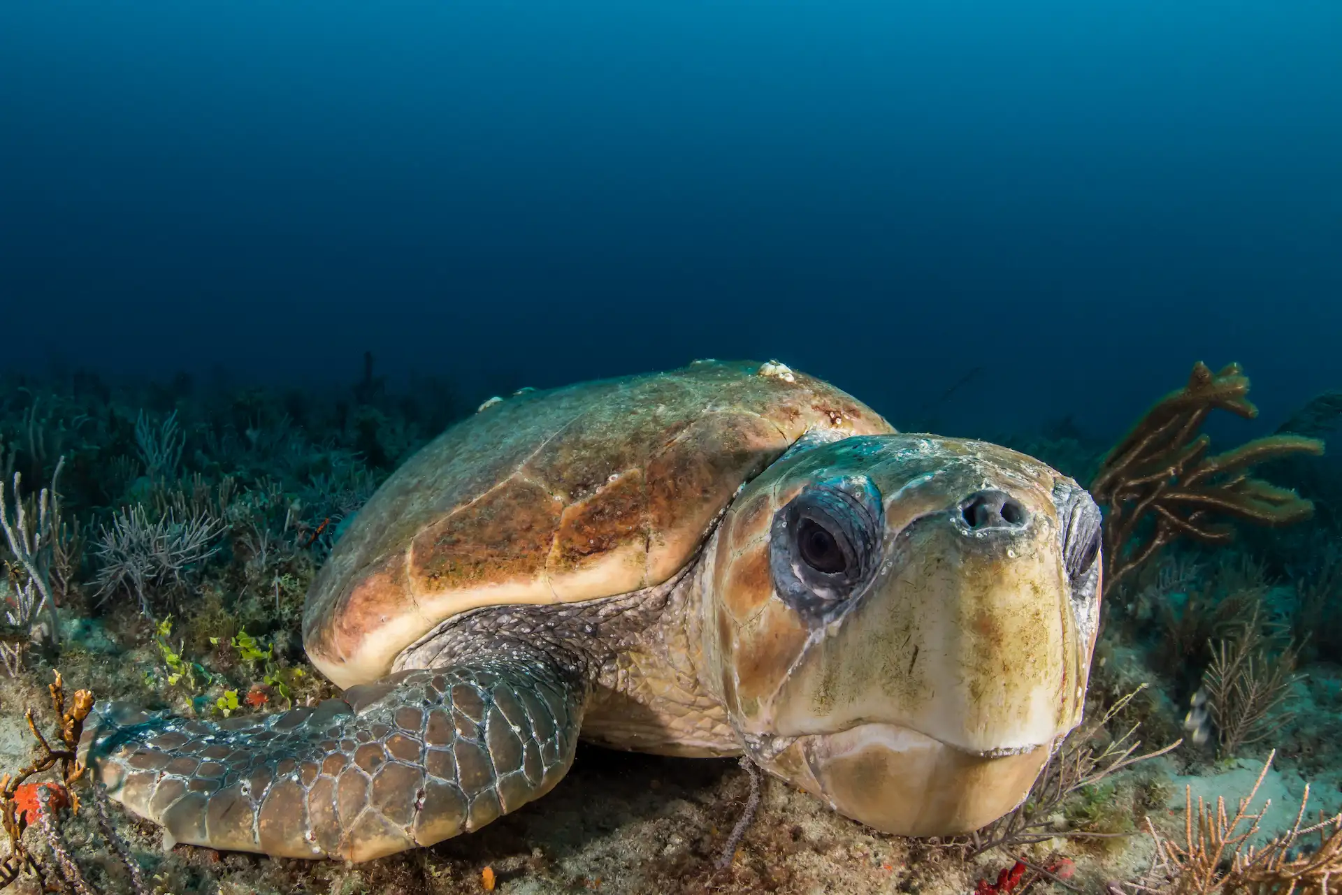 Loggerhead sea turtles are the most widespread sea turtle species in the world, and the most abundant of all sea turtle species in the United States. You can recognize them by their reddish-brown carapace (upper shell), yellow underbelly and their strong jaws that they use to crunch through the hard shells of crustaceans and mollusks. The mouth of the loggerhead sea turtle is actually where they get their name! Some people think their massive head is as big and sturdy as a log.